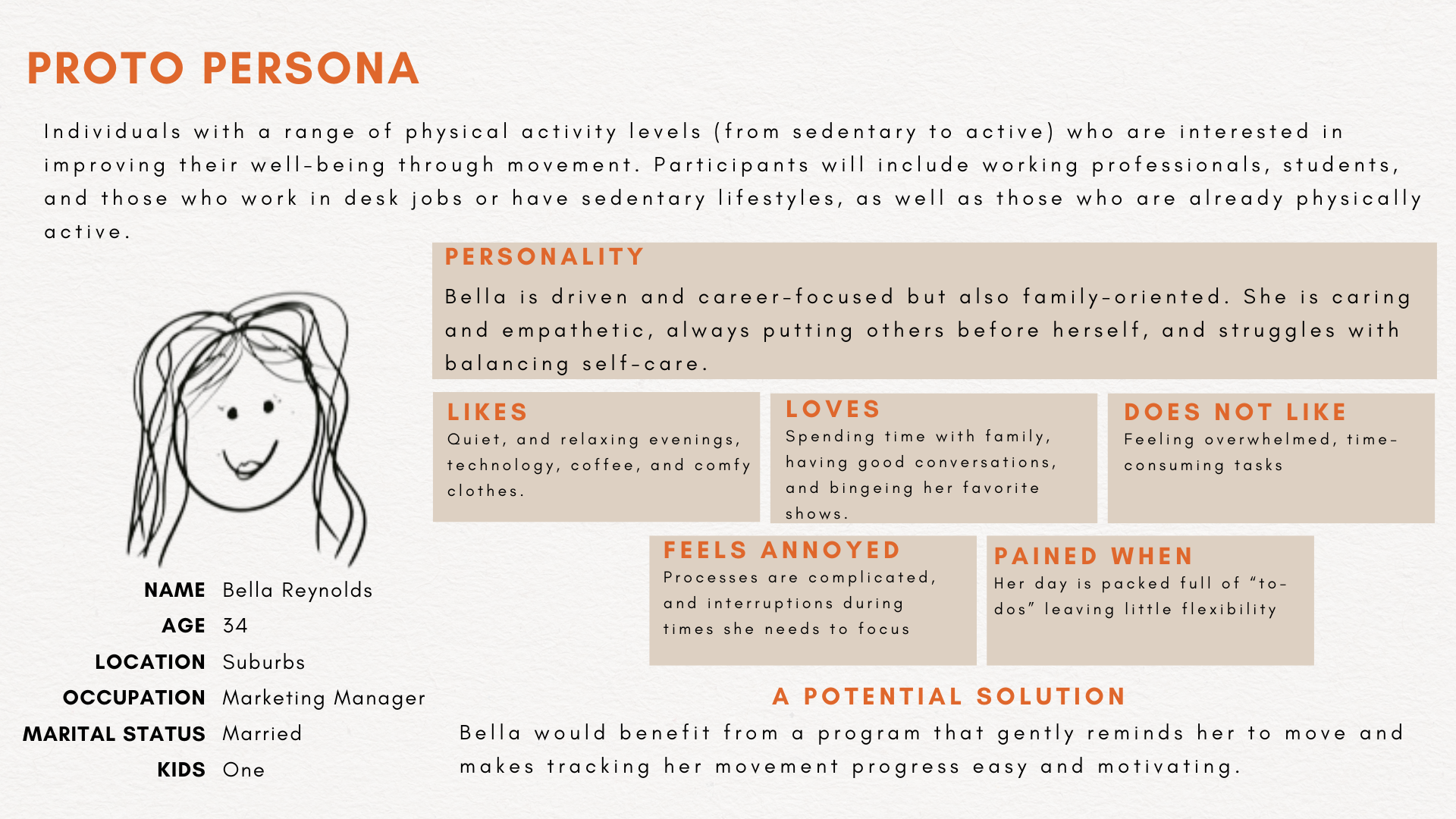 Proto Persona: Meet Bella Reynolds—a career-driven, family-focused marketing manager who struggles to balance self-care with her packed schedule. She loves tech, enjoys quiet evenings, and seeks quick, effective ways to stay active.